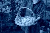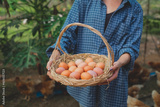 An organic fresh eggs in basket. Concept of caring farming or agriculture and Eco-friendly Food or Eco organic chicken farm, free cage. Local farm or business.