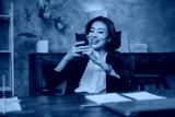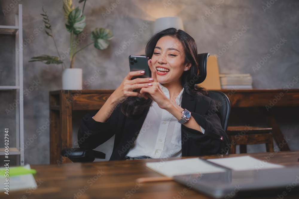 Business woman is using smartphone for searching or watching social media to entertain while breaking time at workplace. Female manager is Laughing and chatting with her friend during break time.