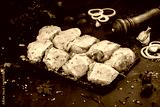 Portion raw chicken thighs for barbecue with sauce and spices.