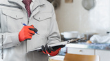 リビング・キッチンを点検する作業服の男性|リフォーム調査・見積り イメージ