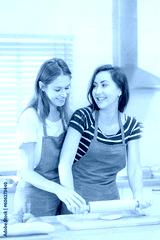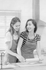 Two caucasian women cooking pizza together in the kitchen. The concept of home cooked food and LGBT relationships. family and diversity concept. lgbt love. warm tone