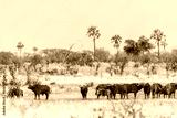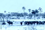 Telephoto shot of a herd of blue wildebeest - Connochaetes taurinus- standing on the Okavango Delta, Botswana.