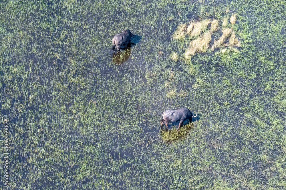 Arial telephoto shot of an African Buffalo -Syncerus caffer- grazing in the Okavango Delta wetlands, Botswana.