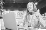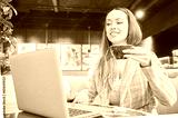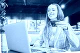 Young smart business woman holding a cup of coffee uses laptop to connect remote work meeting in office cafeteria.