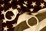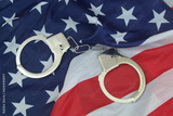 Crimes in United States concept. Steel handcuffs on USA flag.