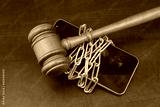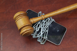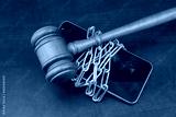 Censorship, law and court verdict concept. Judge gavel on chained broken smartphone on table.