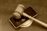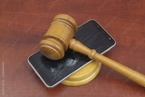 Broken smartphone with wooden gavel on table.