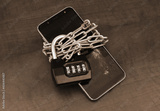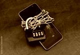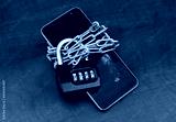 Chained broken smartphone with padlock with numbers 2023. Prohibition and censorship in 2023.