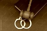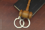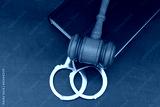 Gavel with steel handcuffs and book on wooden table.