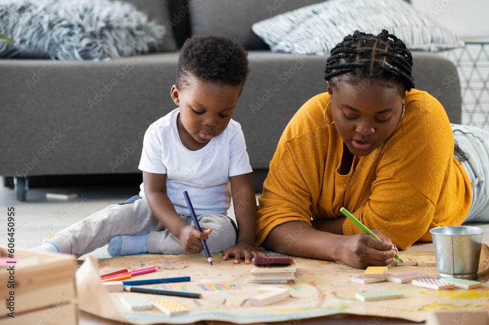 Cheerful African-American mother and cute toddler son playing with colored pencils, drawing on a big piece of paper, and sitting on the floor. Mother-son fun bonding time. Daycare creative activities.