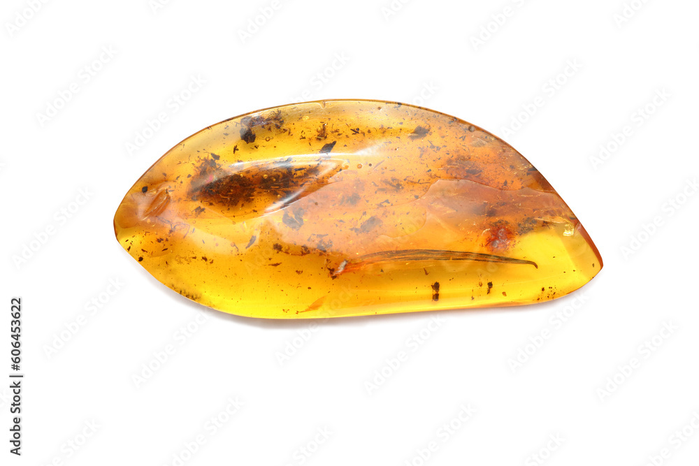 Amber with inclusionon a white background. Sun stone. Fossil fossilized resin. semi-precious mineral. Natural material for jewelry. Copal. Science and geology. Grass ahd leaf in amber stone