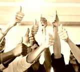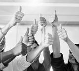 Success, thumbs up and group of people for thank you, support or teamwork hands winning, yes and like emoji. Great, okay and business women or team in collaboration, thanks and winner sign at office