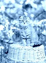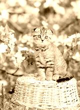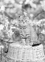 Fold tabby kitten sits on basket at sunny spring park between apple blossoms