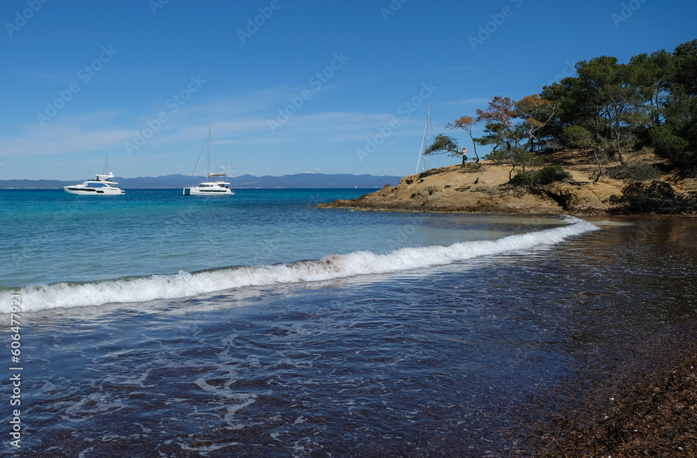 The beautiful coast. The surf. Spring season. The tourist and yachts are in the distance. Porquerolles Island, Provence, France. Copy space.