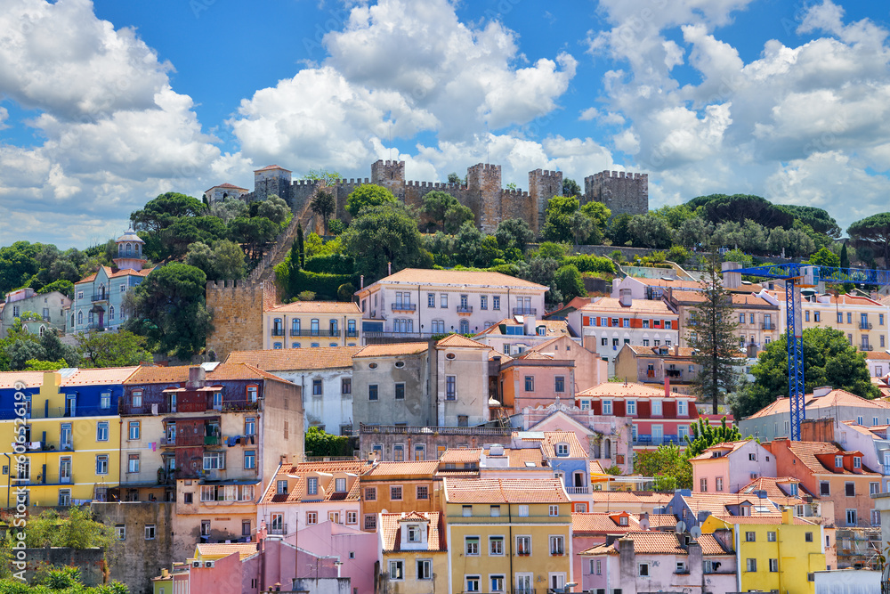 View of colorful residential buildings and the ancient castle of Castelo de S.Jorge in Lisbon, Portugal