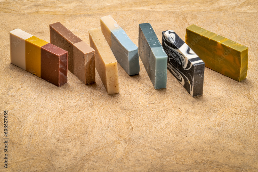 variety of 7 organic, artisan soap bars on a textured bark paper