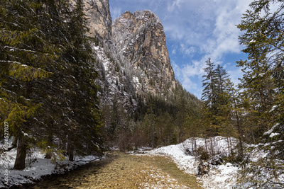 View of a Rienz river in a snowy winter day; trees and blue sky with clouds, Toblach (Dobbiaco), Bolzano, Italy; Dolomites