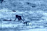 A Chacma Baboon, Papio ursinus, baby with its mother walking along the banks of the Chobe river, Chobe National Park, Botswana.