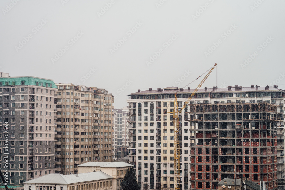 Snow fall on the background of buildings and construction of house