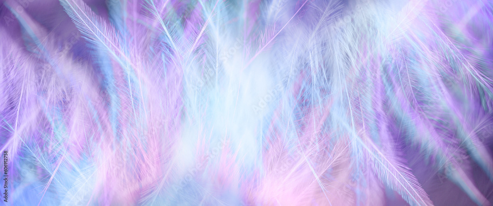 Beautiful purple pink blue delicate fluffy feather background - random long thin wispy soft feathers in pale pink and blue ideal for a spiritual invitation, gift voucher, certificate, award, advert