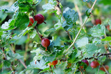 ripe green gooseberries on the bush at harvest time - close-up