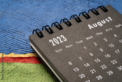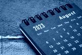 August 2023 - closeup of a small desktop calendar against abstract paper landscape, time and business concept