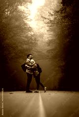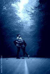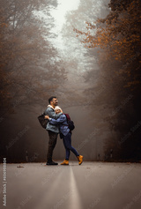 Portrait of couple spending time together walking on forest road on a foggy morning.
