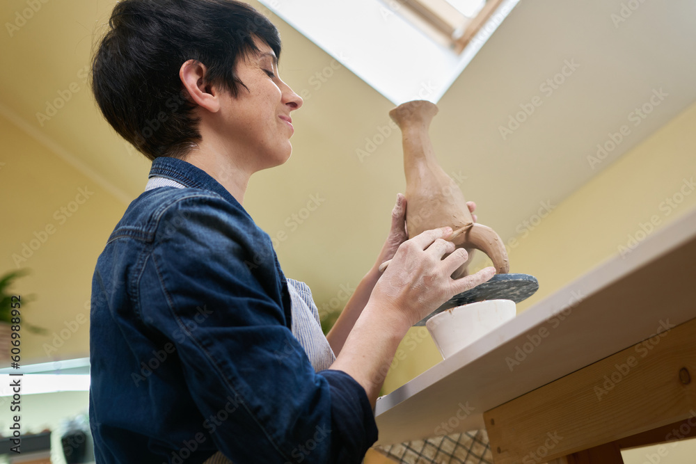 woman sculpts vase from clay by hands, closeup in artistic studio