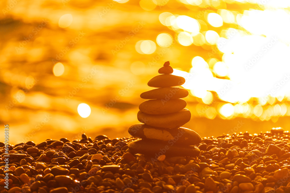 Balanced rock pyramid on pebbles beach. Golden sea bokeh on background. Selective focus, zen stones on sea beach, meditation, spa, harmony, calm, balance concept.