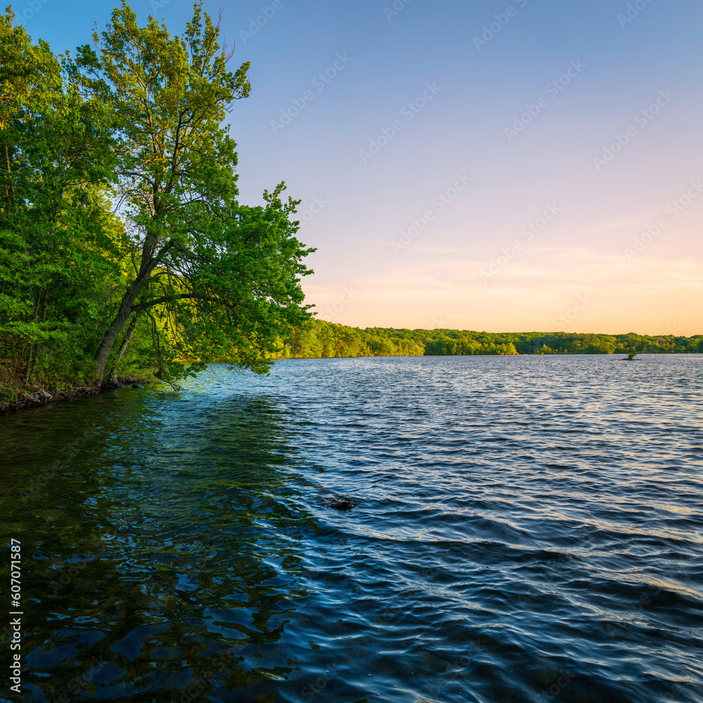 Sunset over the lake forest with slanted trees. Tranquil woodland landscape over Olney Pond at Lincoln Woods State Park Beach in Providence, Rhode Island