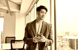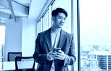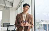 Asian young business man ceo leader holding phone looking at window standing in modern office. Japanese male professional entrepreneur using smartphone thinking of future leadership.