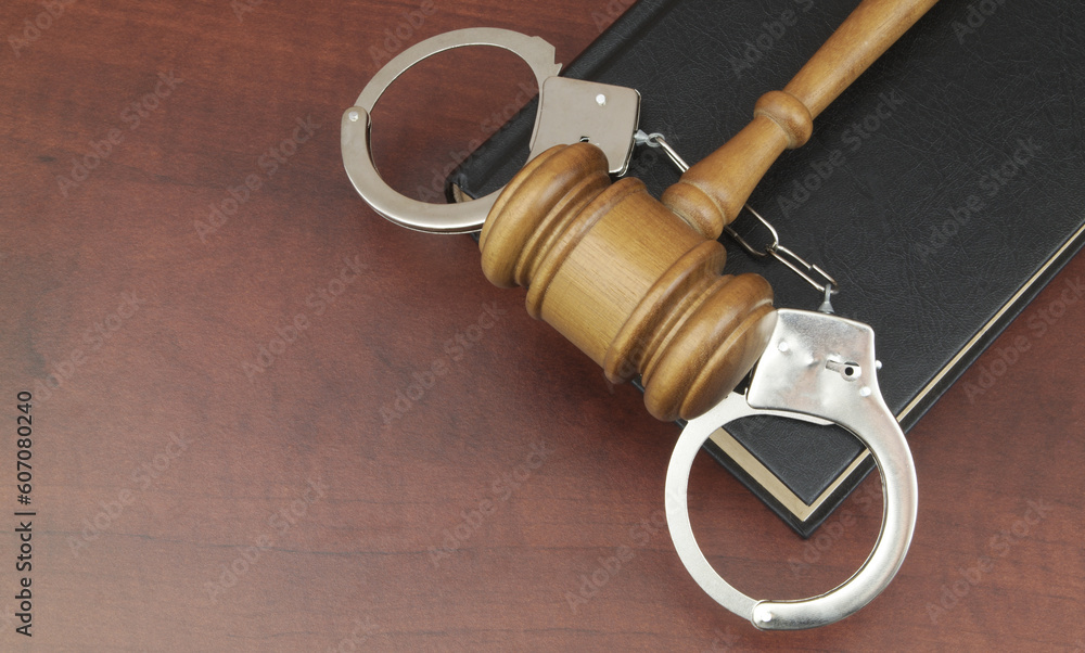 Judge gavel and handcuffs on legal book with copy space for text. Laws and court concept.
