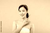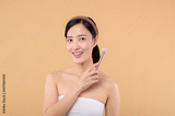 Portrait happy young asian woman with natural make up face holding cosmetic skin powder blusher isolated on beige background. Female apply skincare brush treatment. beauty product cosmetology concept.