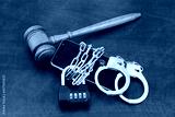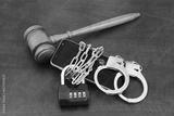 Wooden judge gavel, handcuffs and smartphone chained with padlock with numbers 2023.