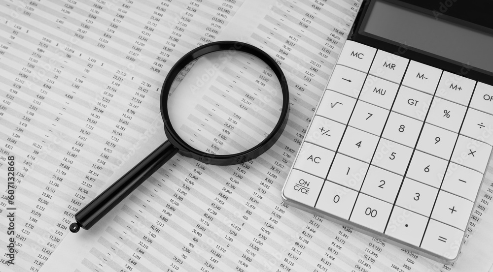 Calculator and magnifying glass on financial statement. Financial, accounting and business concept.