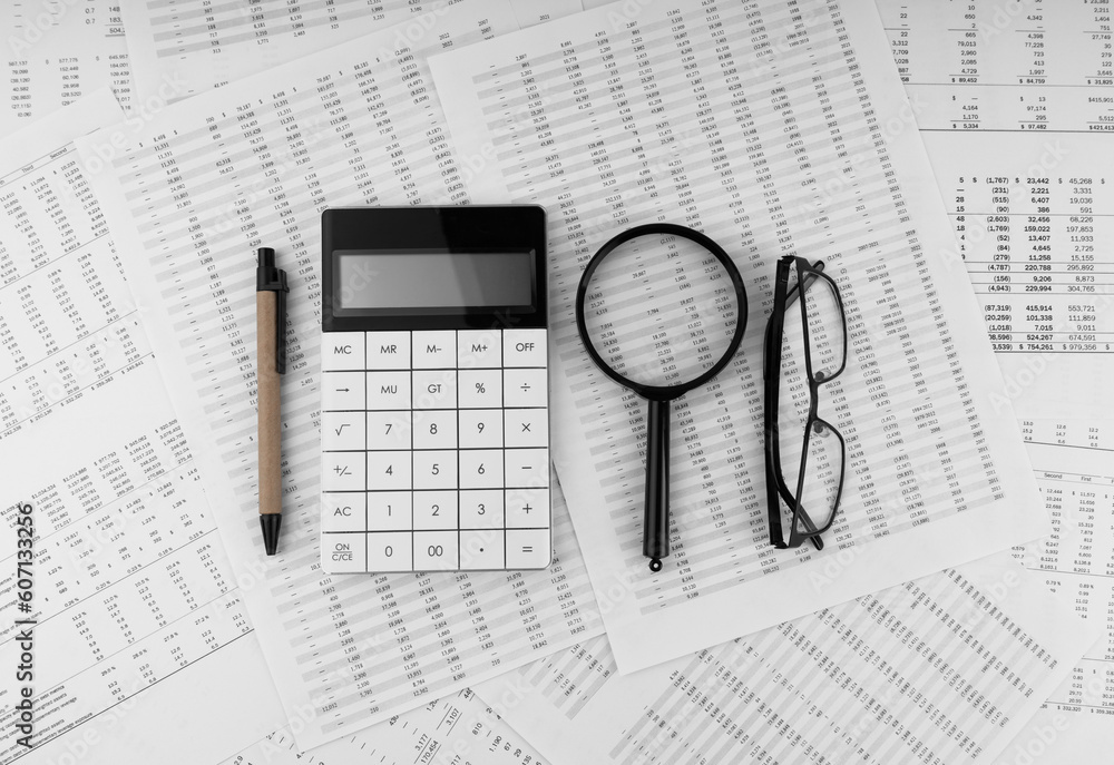 Calculator, magnifying glass, pen, eye glasses on financial statement. Top view.