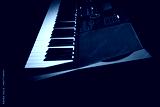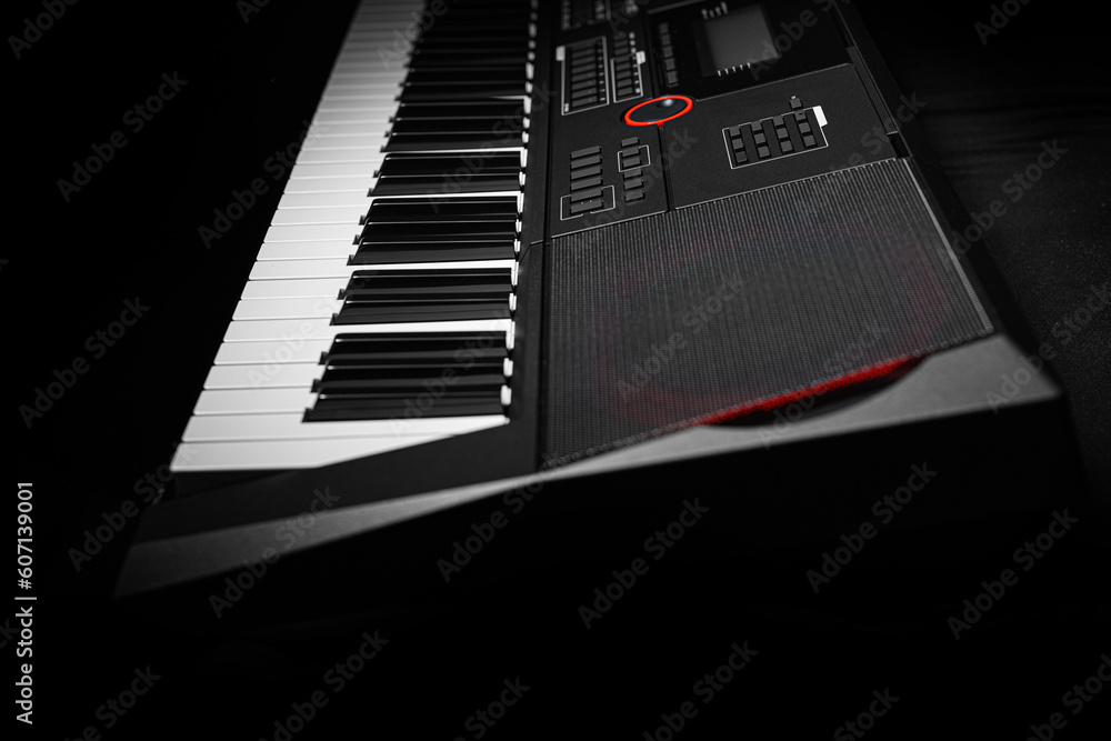Keyboard synthesizer on a dark background. Electric piano close-up.