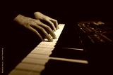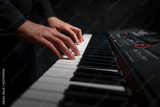 Playing a synthesizer on a dark background. The musician plays the synthesizer.