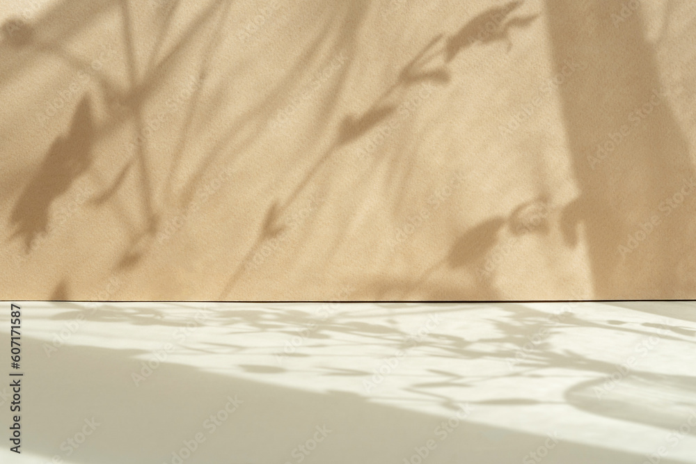 Tropical leaf shadow blank background composition for product presentation. The background is beige. Nude Studio Minimal showcase.