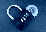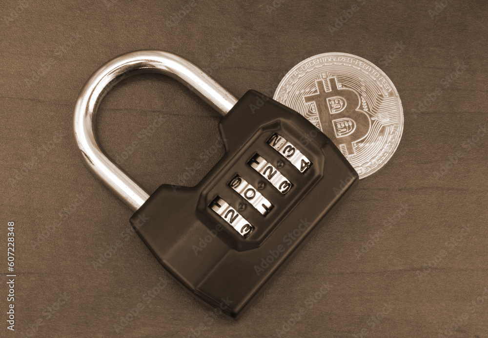 Top view of bitcoin under padlock with numbers 2023. Cryptocurrency protection concept.