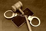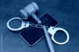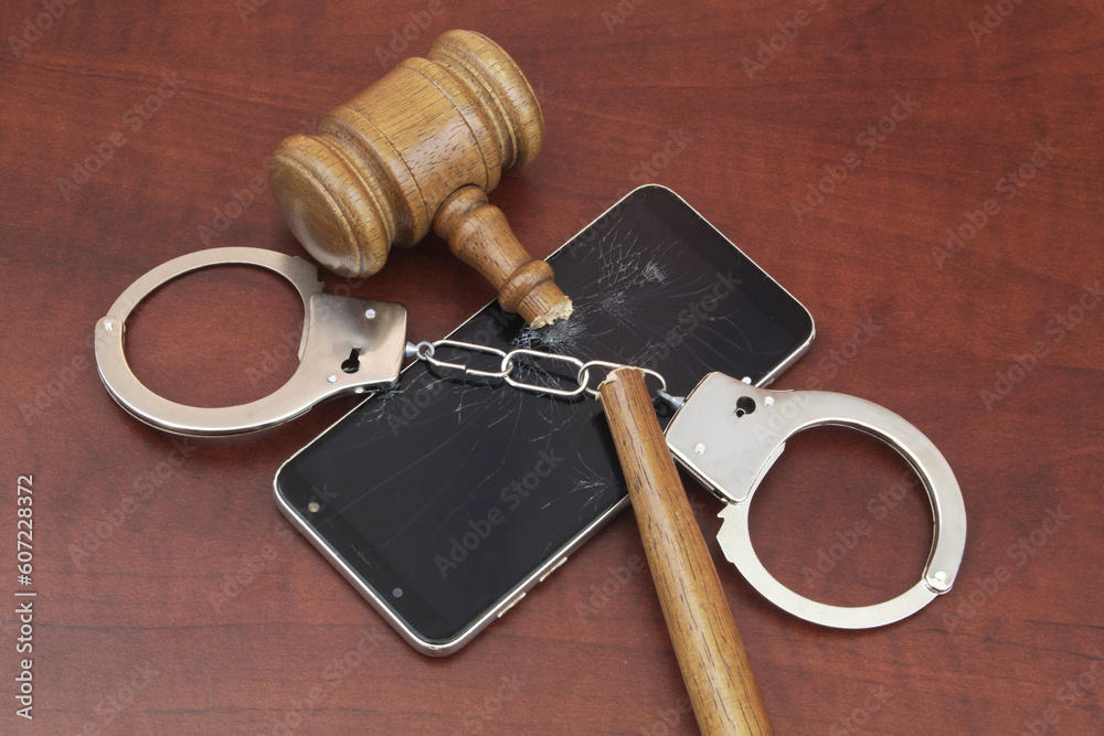Broken wooden gavel and handcuffs with smartphone on table.
