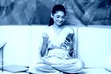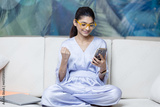 Happy indian lady relax at home alone sit on large couch in comfortable pose share good news at social media via cellphone.