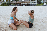 latin couple of Fitness women doing exercise and working out on the caribbean beach in Mexico Latin America, Hispanic Female