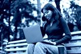 A dark-skinned girl is talking on the phone Working in a laptop in the park.