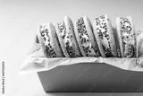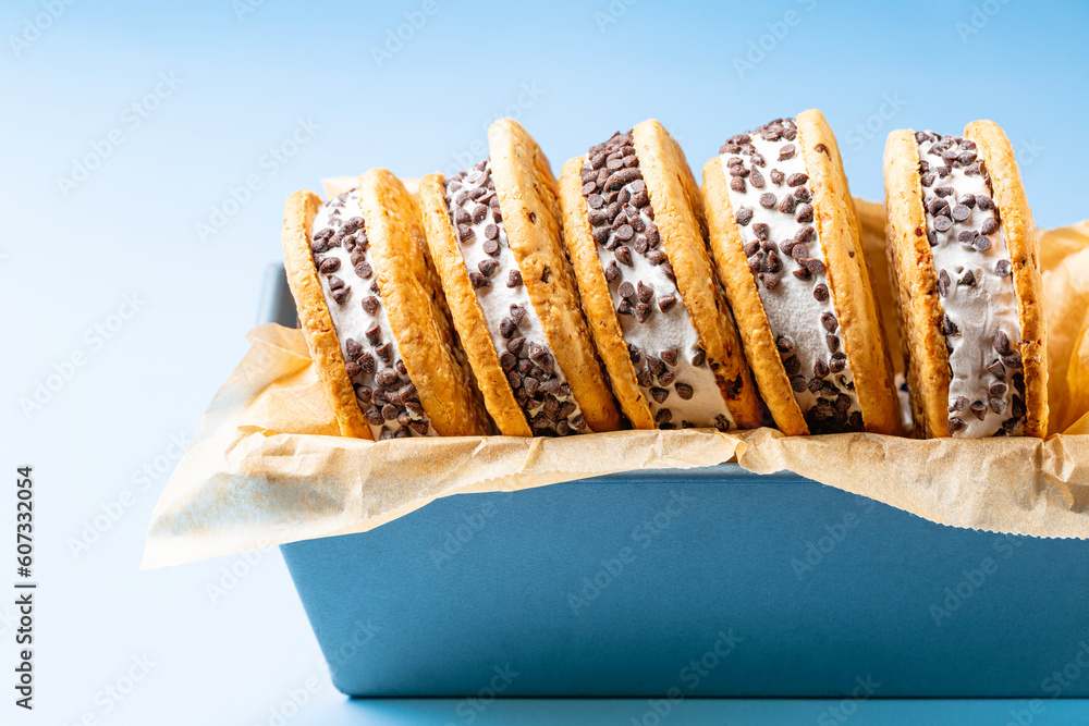 Chocolate Chip Ice Cream Cookie Sandwiches on blue Background. Close-up.