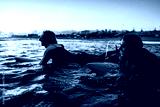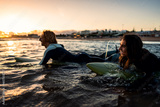 Two surfers with surfboard prepares to hit the waves at sunset.