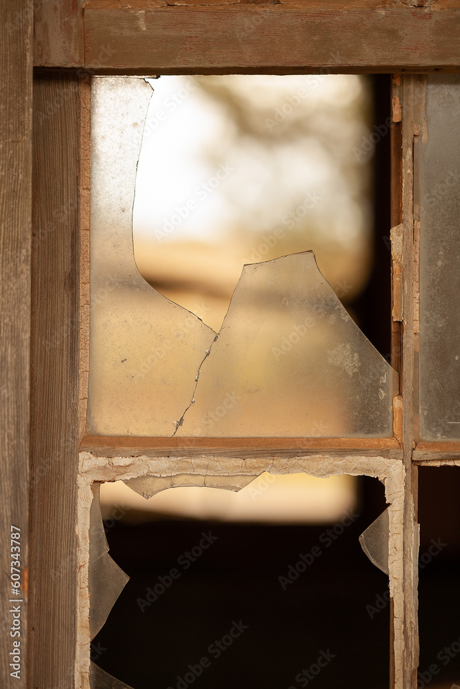 Old timber window frames with broken glass