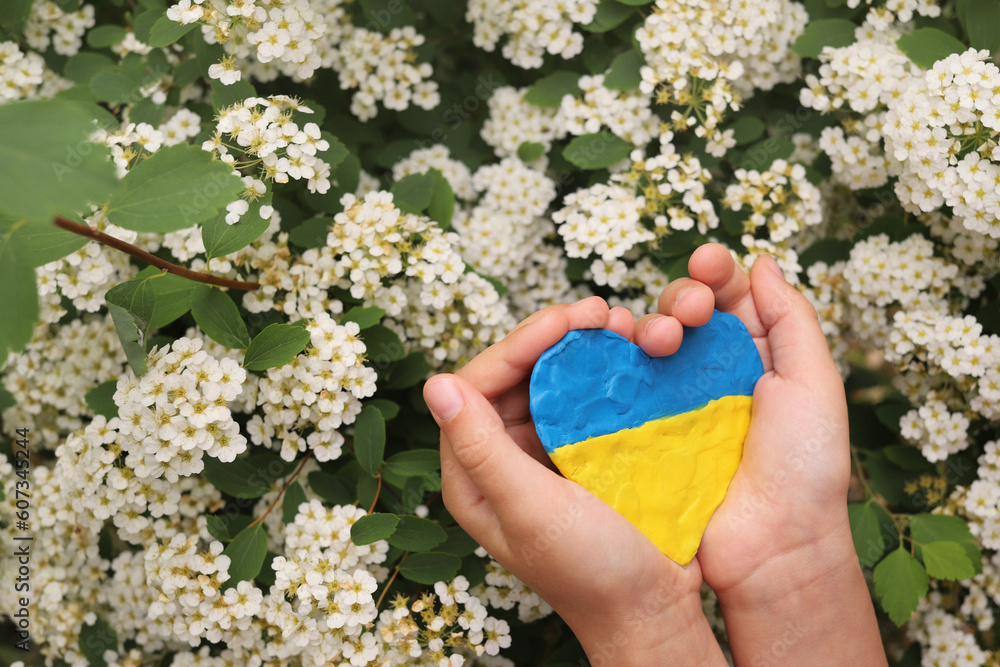 child hands holding a heart made of plasticine in the color of the flag of Ukraine on a background of flowers. copy space for text