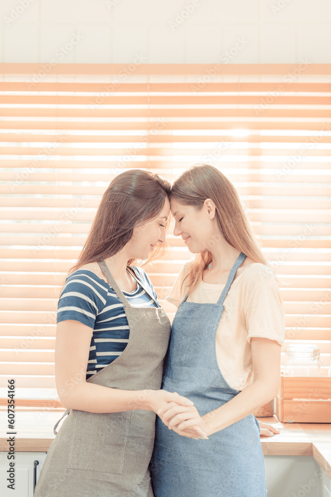 Lesbian Couple Together Indoors Concept. Lesbian in the kitchen. Young women are in a mutual lesbian love relationship. LGBT concept. warm tone.