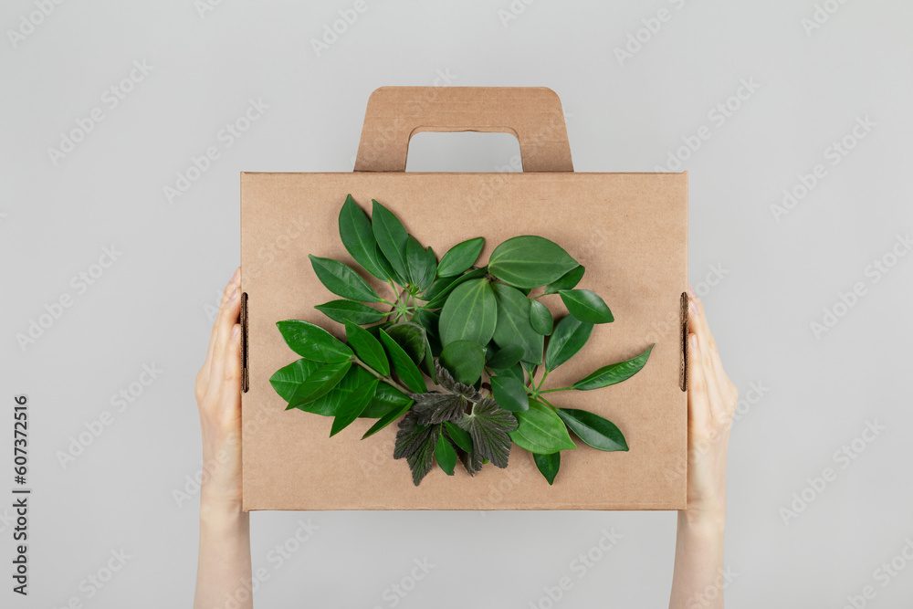 Eco cardboard box from natural recyclable materials with green leaves in woman hands. Eco friendly packaging, zero waste, plastic free and nature protection concept.